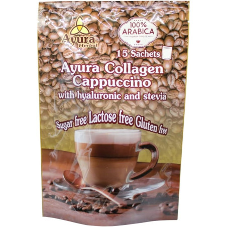 Sobre las propiedades beneficiosas del Colageno Capuccino Ayura: * 1Paquete contiene 15 sobres individuales de 15 gr unidad. *Puede contribuir a la salud de nuestra piel y darle elasticidad. *Puede fortalecer nuestro cabello y uñas quebradas débiles etc. *Protege las articulaciones, el cartilago, los ligamentos, puede reducir las molestias articulares. *Ayuda a reducir la posibilidad de desarrollar osteoporosis. *Apoya la funcion muscular adecuada. *Puede ayudar a combatir la cellulitis. *Apoya el buen funcionamiento del corazón. *Rico en Vitaminas A, C, E. *Acido Hialuronico puede ayudar a "lubricar" las articulaciones y hacer que funcionen de manera eficiente, así mismo darle una lubricacion extra a nuestra piel. *Puede ayudar a mejorar el rendimiento físico debido al contenido de Coencima Q-10. *El cafe apoya, entre otras cosas, la pérdida de peso, la buena función cerebral y la circulación sanguinea adecuada. *CONTIENE Stevia Natural de origen vegetal y sin azúcar como Edulcorante. *NO contiene GLUTEN. *NO contiene LACTOSA. *NO contiene AZUCAR. INGREDIENTES: cafe Arabica 100%,crema no láctea de coco en polvo, Colageno Marino tipo-all, Peptidos de Colageno, Tripeptidos de Colageno, Pipeptidos de Colageno, Cereza de Barbados (Acerola Vitamina-C), Hongo Snow Mushroom. Coenzima Q-10.Stevia, Extracto de semillas de uva. Ceramides de arroz, Vitaminas-A y E. r